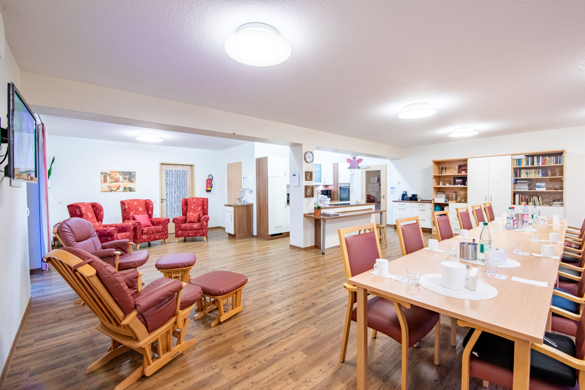 Die helle und freundliche Innengestaltung sowie saisonale Dekorationen machen die Einrichtung zu einem echten Wohlfühlort. Dazu gehören sorgsam ausgewählte Farben, angenehme Beleuchtung und gemütliches Mobiliar, das auch den pflegerischen Ansprüchen der Senioren entgegenkommt. Rund um das Haus wurde das Grundstück seniorengerecht angelegt – mit verschiedenen Treffpunkten für die Bewohner und Highlights wie einem Pavillon oder Hochbeeten.